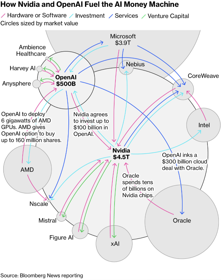 OpenAi is raking in up to a trillion dollars in investments. But it's mostly just the same money being shuffled around across different companies. Source: Bloomberg