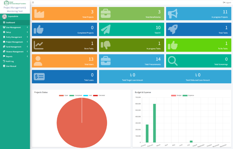 We developed a comprehensive ECCCP-Flood tracking tool that transformed how PKSF manages climate change projects, providing end-to-end visibility and control over complex, multi-stakeholder initiatives.The Project Oversight System enables PKSF to set up, assign, and monitor multi-phase project workflows and track progress across all implementing partners and locations. The platform provides a centralized dashboard where project managers can view the status of activities, identify bottlenecks, and ensure projects stay on schedule. This systematic approach to workflow management eliminates the chaos of disparate tracking methods and creates a single source of truth for project status across the entire initiative.The Integrated Fund Control module delivers sophisticated financial management capabilities, tracking budget lines, disbursements, reimbursements, and funding sources in real-time. PKSF administrators can monitor how funds flow through the project ecosystem, ensure budgets are adhered to, track expenditures against approved budgets, and manage reimbursement processes.